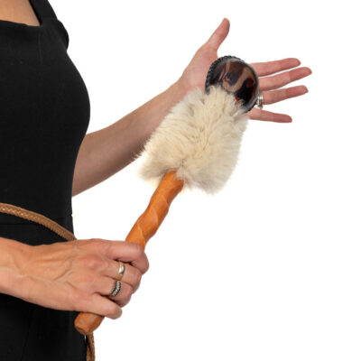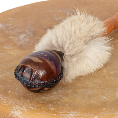 Fait d'une peau de Bison et bois de rose. Éclats de pierre à l'intérieur et fourrure de renard blanc recyclée. Le hochet est l’allié du tambour durant vos cérémonies, soins énergétiques et purifications de vos espaces de vie. Le hochet facilite l’état de transe chamanique, nous rappelant notre reliance aux étoiles par ses éclats de pierre à l’intérieur. Le hochet chamanique est orné de fourrure recyclée, honorant l’esprit de l’animal tout en nous accompagnant par ses vertus totémiques. Cet allié du tambour ancre le corps d’énergie X et active le pont entre l’humain et le divin.