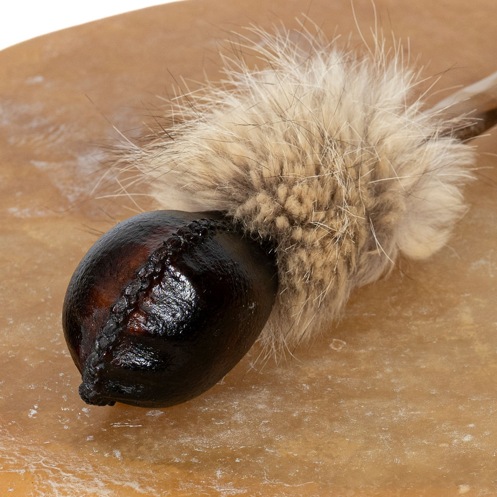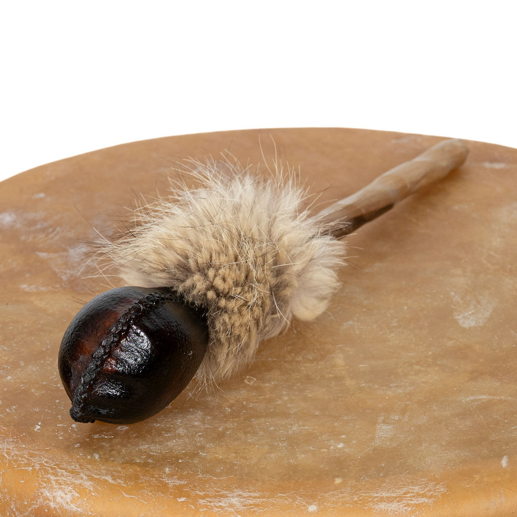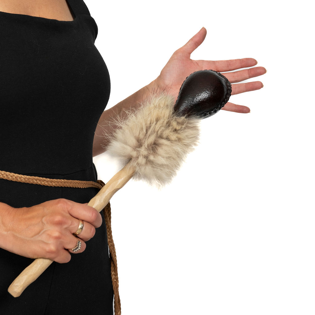 Fait d'une peau de Bison et bois de rose. Éclats de pierre à l'intérieur et fourrure de renard blanc recyclée. Le hochet est l’allié du tambour durant vos cérémonies, soins énergétiques et purifications de vos espaces de vie. Le hochet facilite l’état de transe chamanique, nous rappelant notre reliance aux étoiles par ses éclats de pierre à l’intérieur. Le hochet chamanique est orné de fourrure recyclée, honorant l’esprit de l’animal tout en nous accompagnant par ses vertus totémiques. Cet allié du tambour ancre le corps d’énergie X et active le pont entre l’humain et le divin.