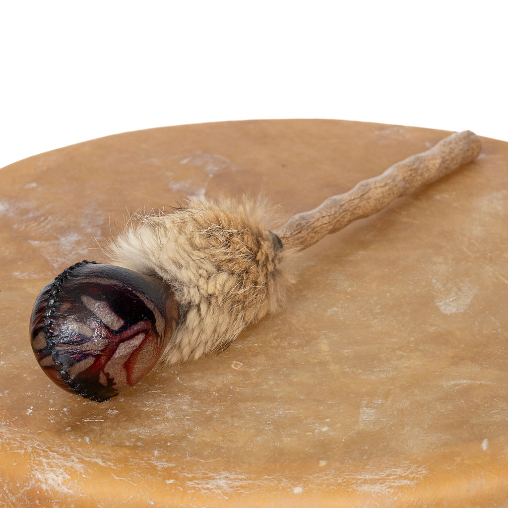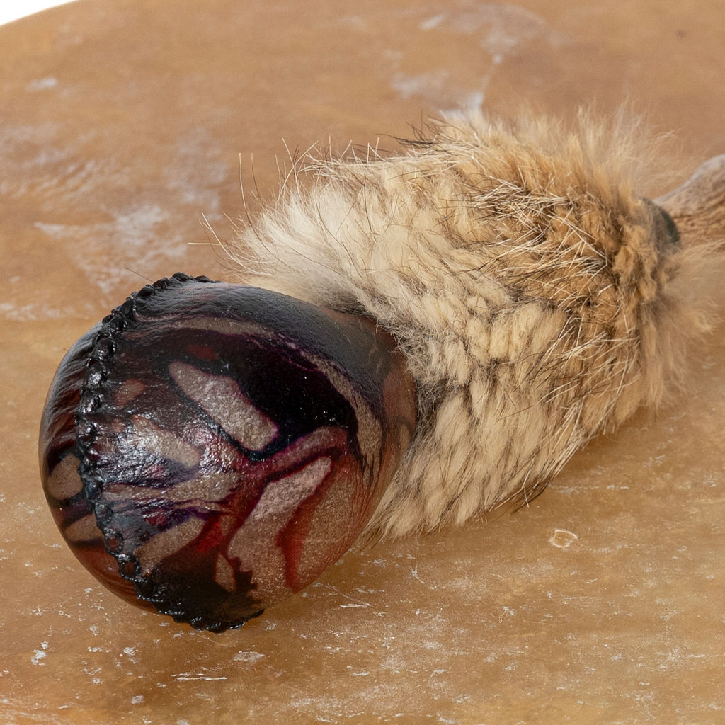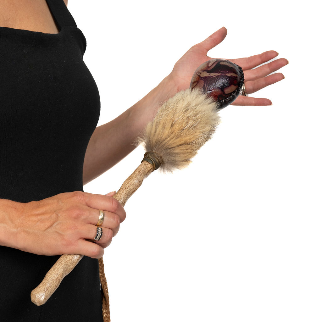 Fait d'une peau de Bison et bois de rose. Éclats de pierre à l'intérieur et fourrure de renard blanc recyclée. Le hochet est l’allié du tambour durant vos cérémonies, soins énergétiques et purifications de vos espaces de vie. Le hochet facilite l’état de transe chamanique, nous rappelant notre reliance aux étoiles par ses éclats de pierre à l’intérieur. Le hochet chamanique est orné de fourrure recyclée, honorant l’esprit de l’animal tout en nous accompagnant par ses vertus totémiques. Cet allié du tambour ancre le corps d’énergie X et active le pont entre l’humain et le divin.