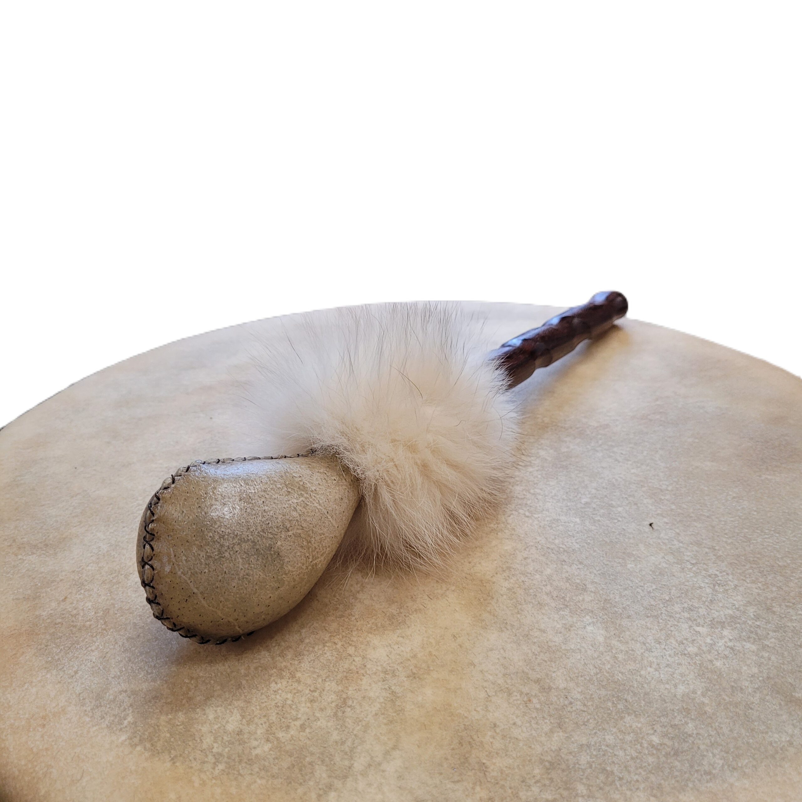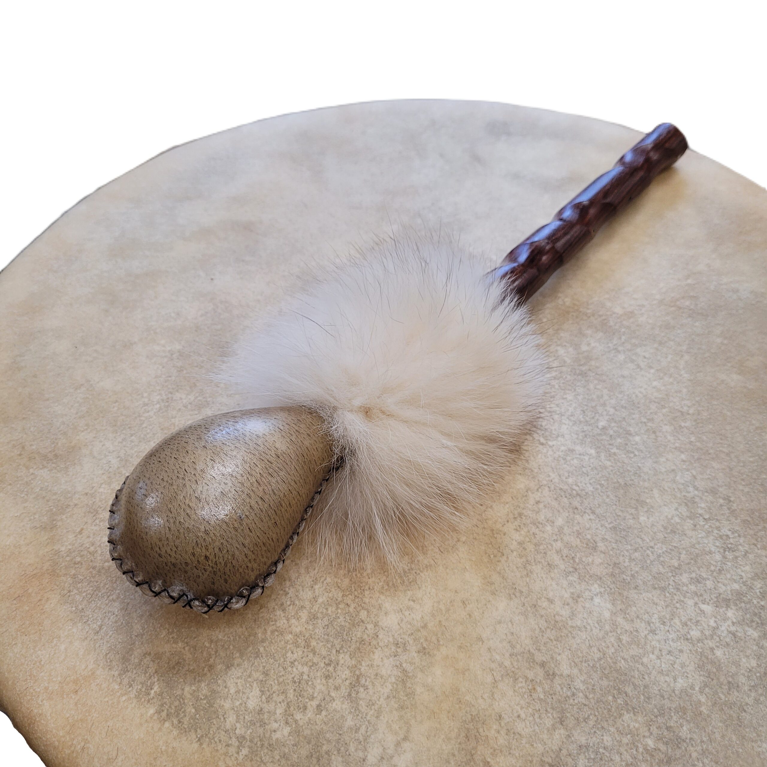 Fait d'une peau de Bison ou de Wapiti et d'un manche en bois de rose. Éclats de pierre à l'intérieur et fourrure de renard recyclée. Le hochet est l’allié du tambour durant vos cérémonies, soins énergétiques et purifications de vos espaces de vie. Le hochet facilite l’état de transe chamanique, nous rappelant notre reliance aux étoiles par ses éclats de pierre à l’intérieur. Le hochet chamanique est orné de fourrure recyclée, honorant l’esprit de l’animal tout en nous accompagnant par ses vertus totémiques. Cet allié du tambour ancre le corps d’énergie X et active le pont entre l’humain et le divin.