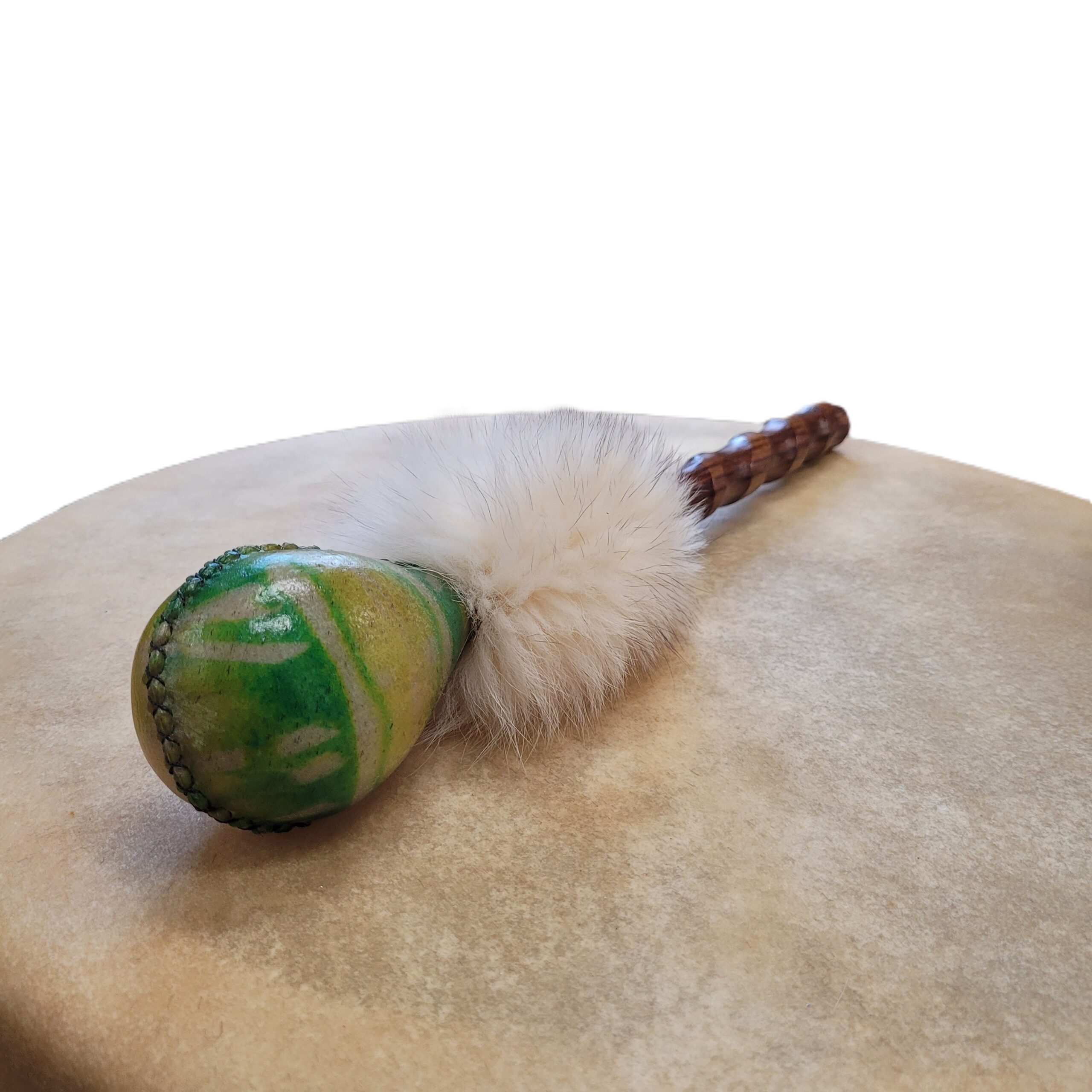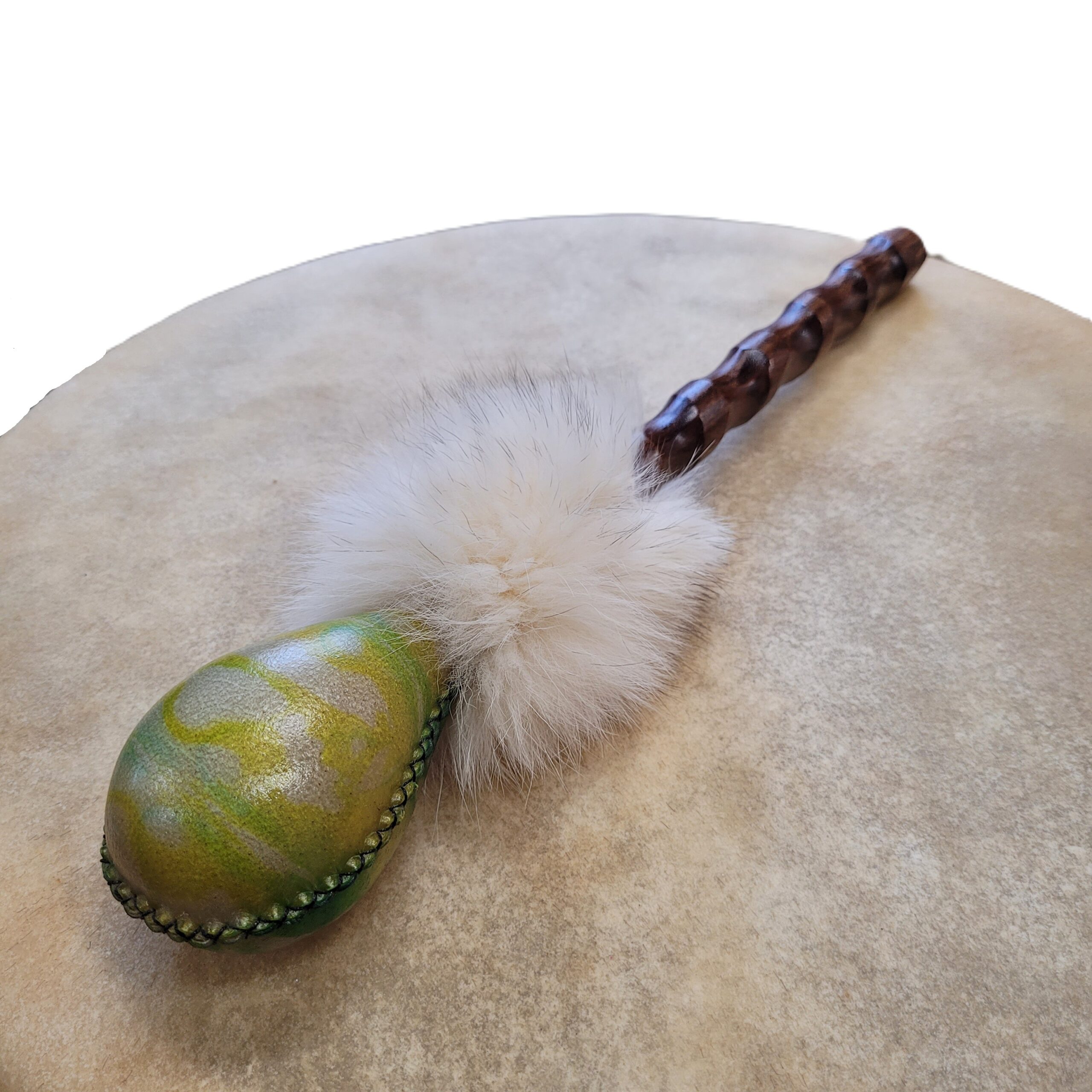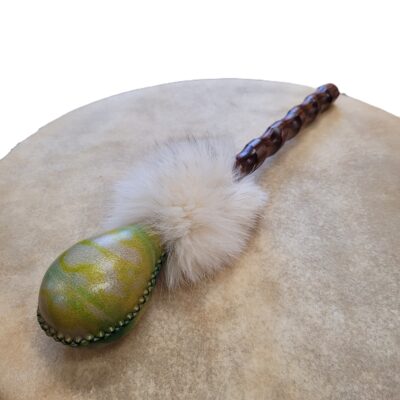 Fait d'une peau de Bison ou de Wapiti et d'un manche en bois de rose. Éclats de pierre à l'intérieur et fourrure de renard recyclée. Le hochet est l’allié du tambour durant vos cérémonies, soins énergétiques et purifications de vos espaces de vie. Le hochet facilite l’état de transe chamanique, nous rappelant notre reliance aux étoiles par ses éclats de pierre à l’intérieur. Le hochet chamanique est orné de fourrure recyclée, honorant l’esprit de l’animal tout en nous accompagnant par ses vertus totémiques. Cet allié du tambour ancre le corps d’énergie X et active le pont entre l’humain et le divin.