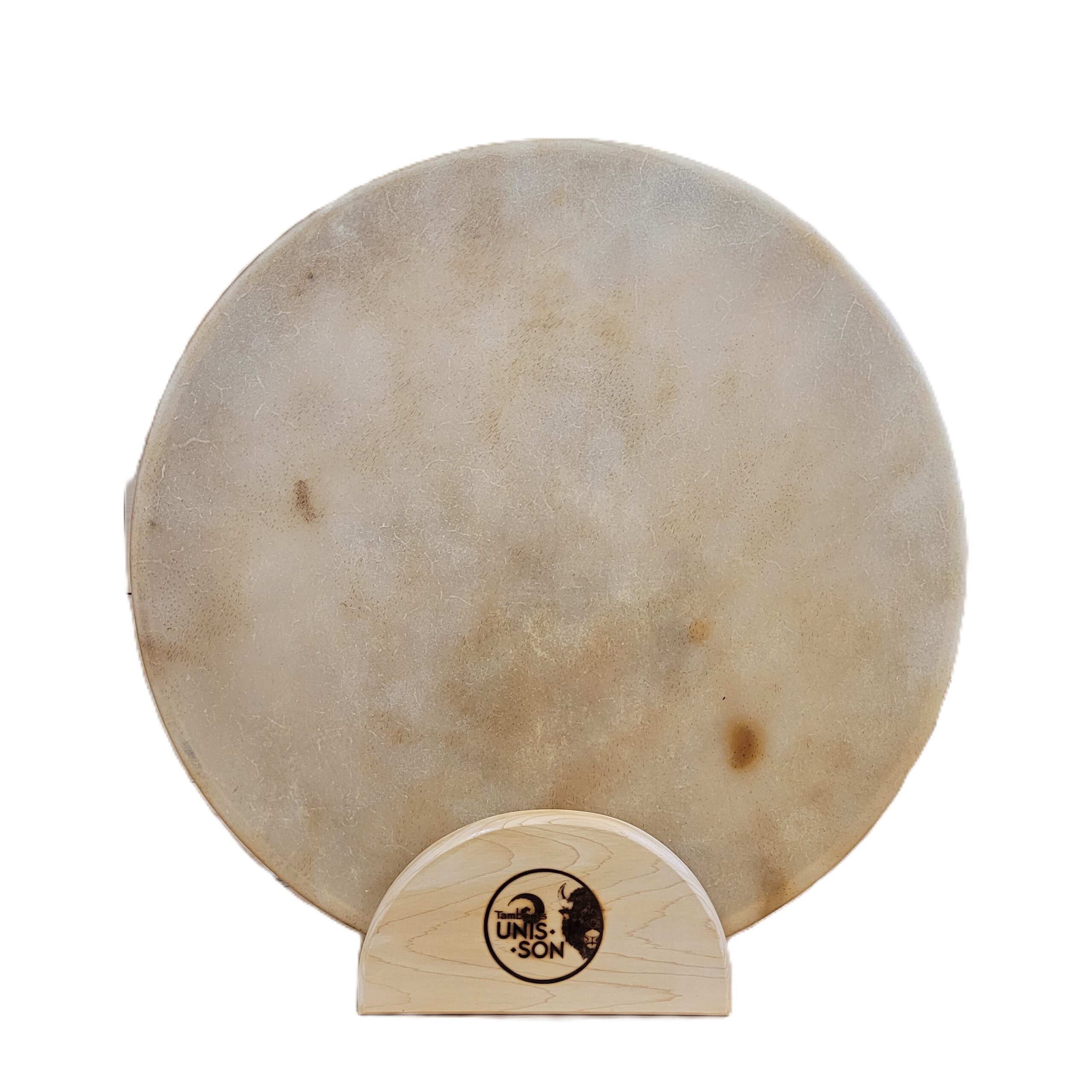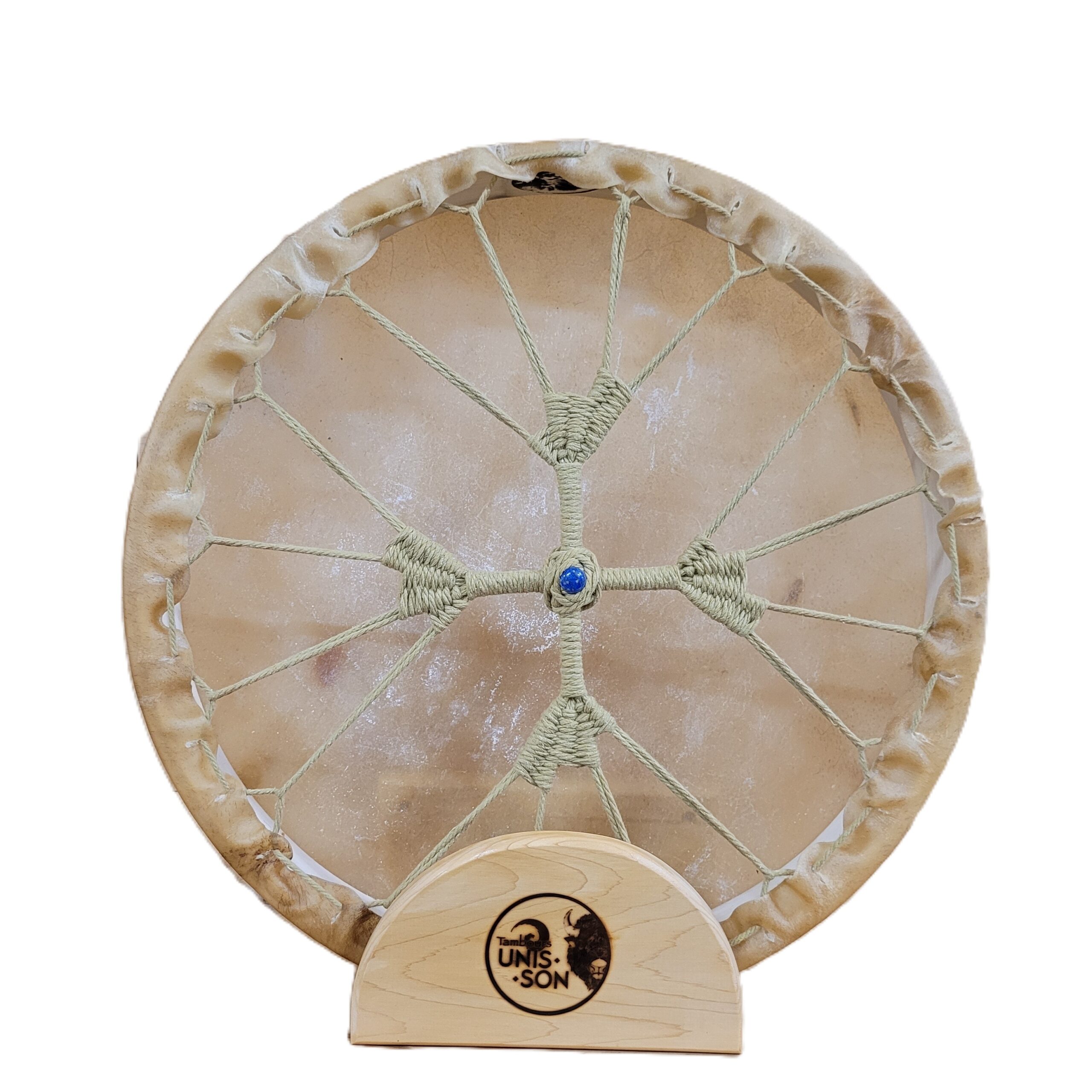 Notre tambour à main Unis-Son est fait d'une peau de Bison et un cercle en bois d'érable. (18"/45 cm). Le tissage contour est idéal pour les régions humides et la poignée en 100% coton contient une pierre au milieu. Une mailloche est incluse. Fabriqué à la main avec amour au Québec.