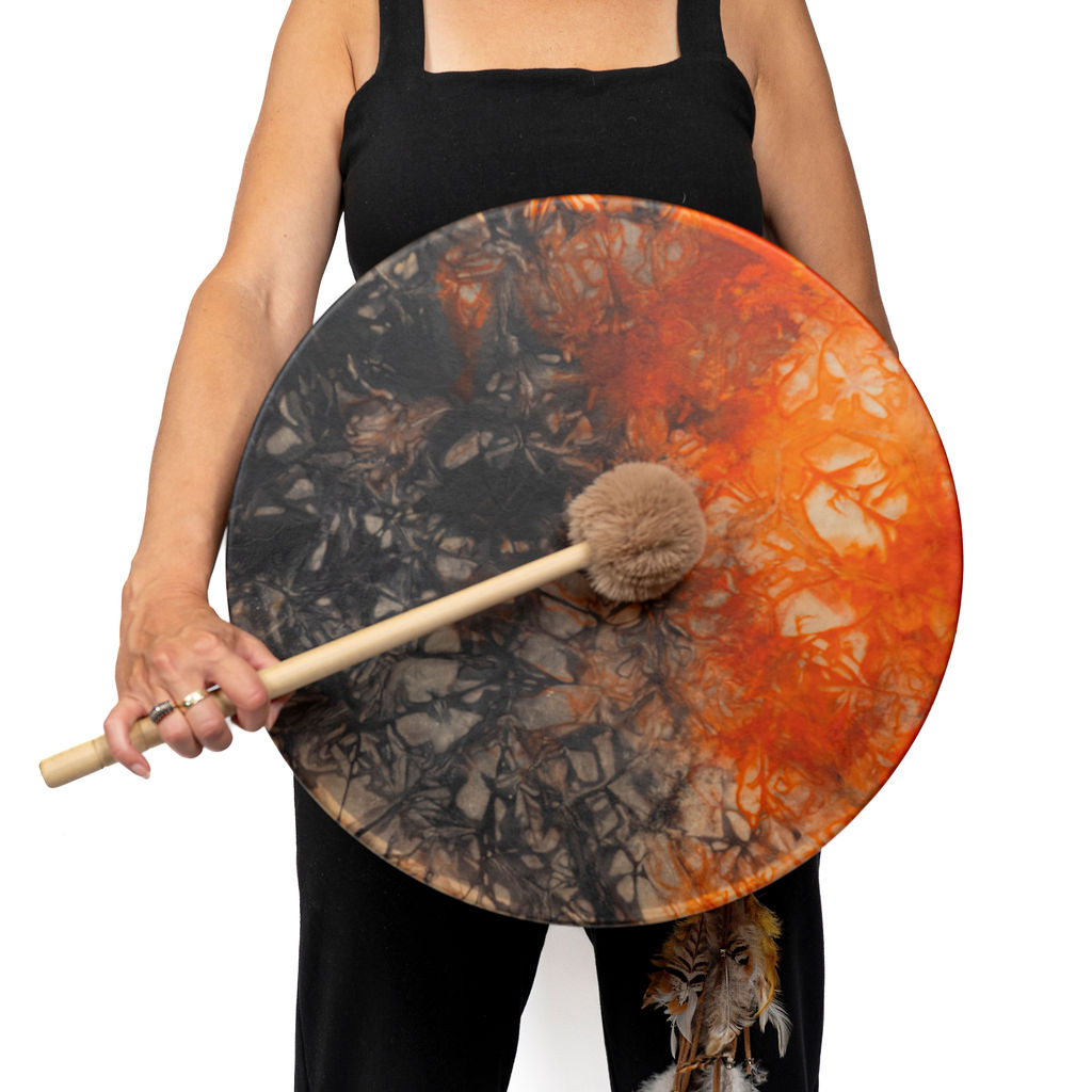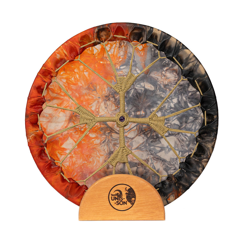 Notre tambour à main Unis-Son est fait d’une peau de Bison et un cercle en bois d’érable (18″/45 cm). Le tissage contour est idéal pour les régions humides et la poignée en 100% coton contient une pierre au milieu. Une mailloche est incluse. Fabriqué à la main avec amour au Québec.