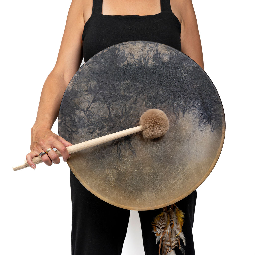 Notre tambour à main Unis-Son est fait d’une peau de Bison et un cercle en bois d’érable (18″/45 cm). Le tissage contour est idéal pour les régions humides et la poignée en 100% coton contient une pierre au milieu. Une mailloche est incluse. Fabriqué à la main avec amour au Québec.