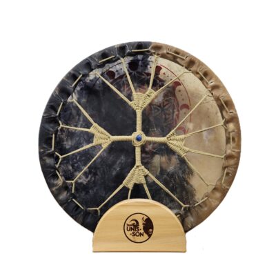 Notre tambour à main Unis-Son peint est fait d’une peau de Bison et un cercle en bois d’érable (18″/45 cm). Le tissage contour est idéal pour les régions humides et la poignée en 100% coton contient une pierre au milieu. Une mailloche est incluse. Fabriqué et peint à la main avec amour au Québec.