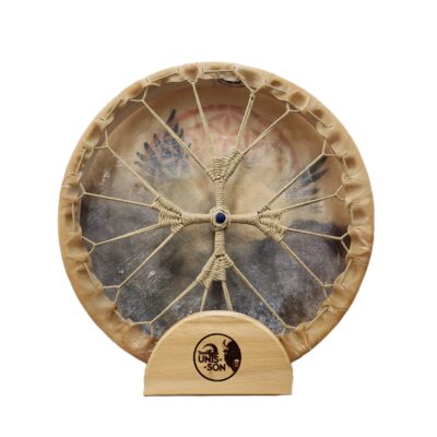 Notre tambour à main Unis-Son peint est fait d’une peau de Bison et un cercle en bois d’érable (18″/45 cm). Le tissage contour est idéal pour les régions humides et la poignée en 100% coton contient une pierre au milieu. Une mailloche est incluse. Fabriqué et peint à la main avec amour au Québec.
