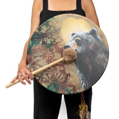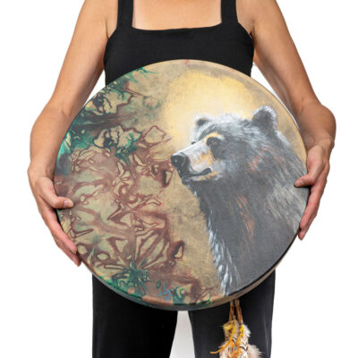 Notre tambour à main Unis-Son peint est fait d’une peau de Bison et un cercle en bois d’érable (18″/45 cm). Le tissage contour est idéal pour les régions humides et la poignée en 100% coton contient une pierre au milieu. Une mailloche est incluse. Fabriqué et peint à la main avec amour au Québec.