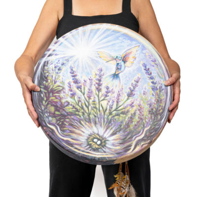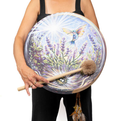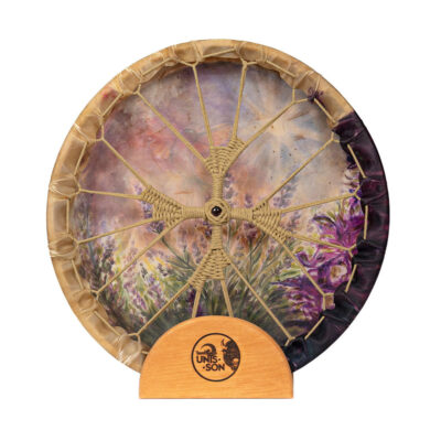 Notre tambour à main Unis-Son peint est fait d’une peau de Bison et un cercle en bois d’érable (18″/45 cm). Le tissage contour est idéal pour les régions humides et la poignée en 100% coton contient une pierre au milieu. Une mailloche est incluse. Fabriqué et peint à la main avec amour au Québec.