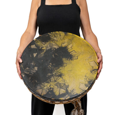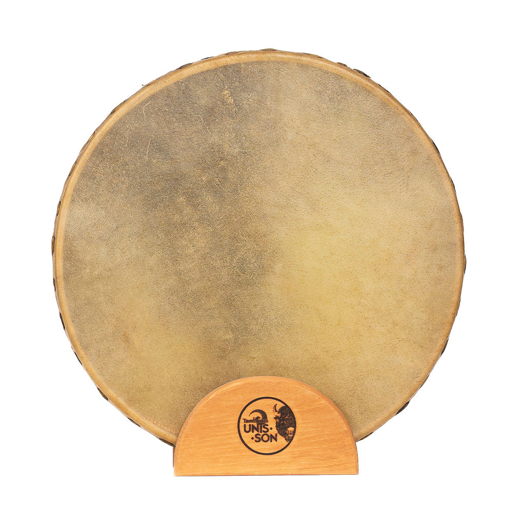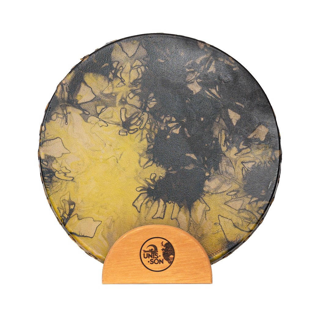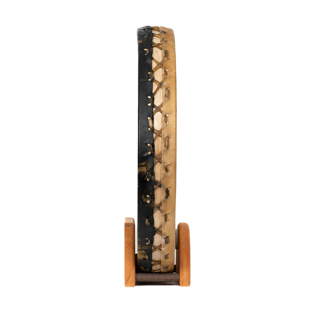 Le tambour Océan est fait de deux peaux de Bison, un cadre en bois d’érable et des billes de cuivre.
