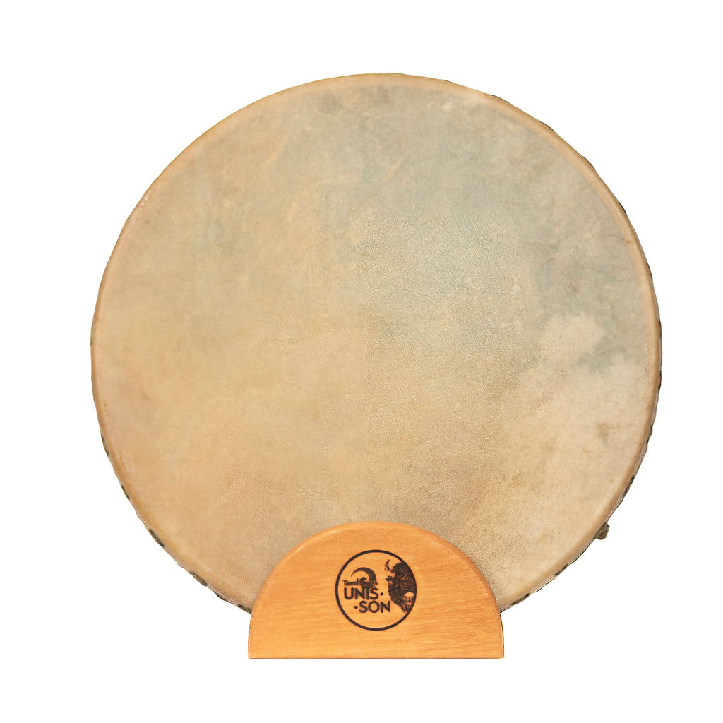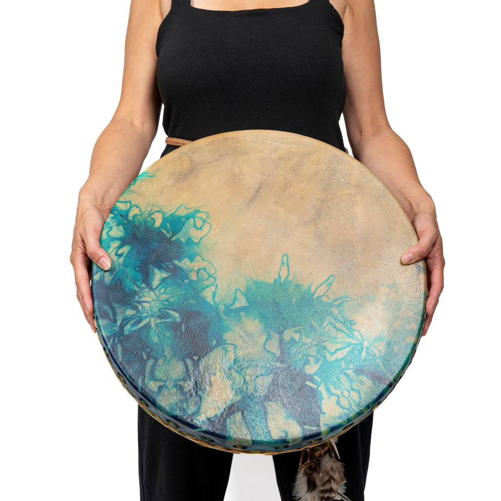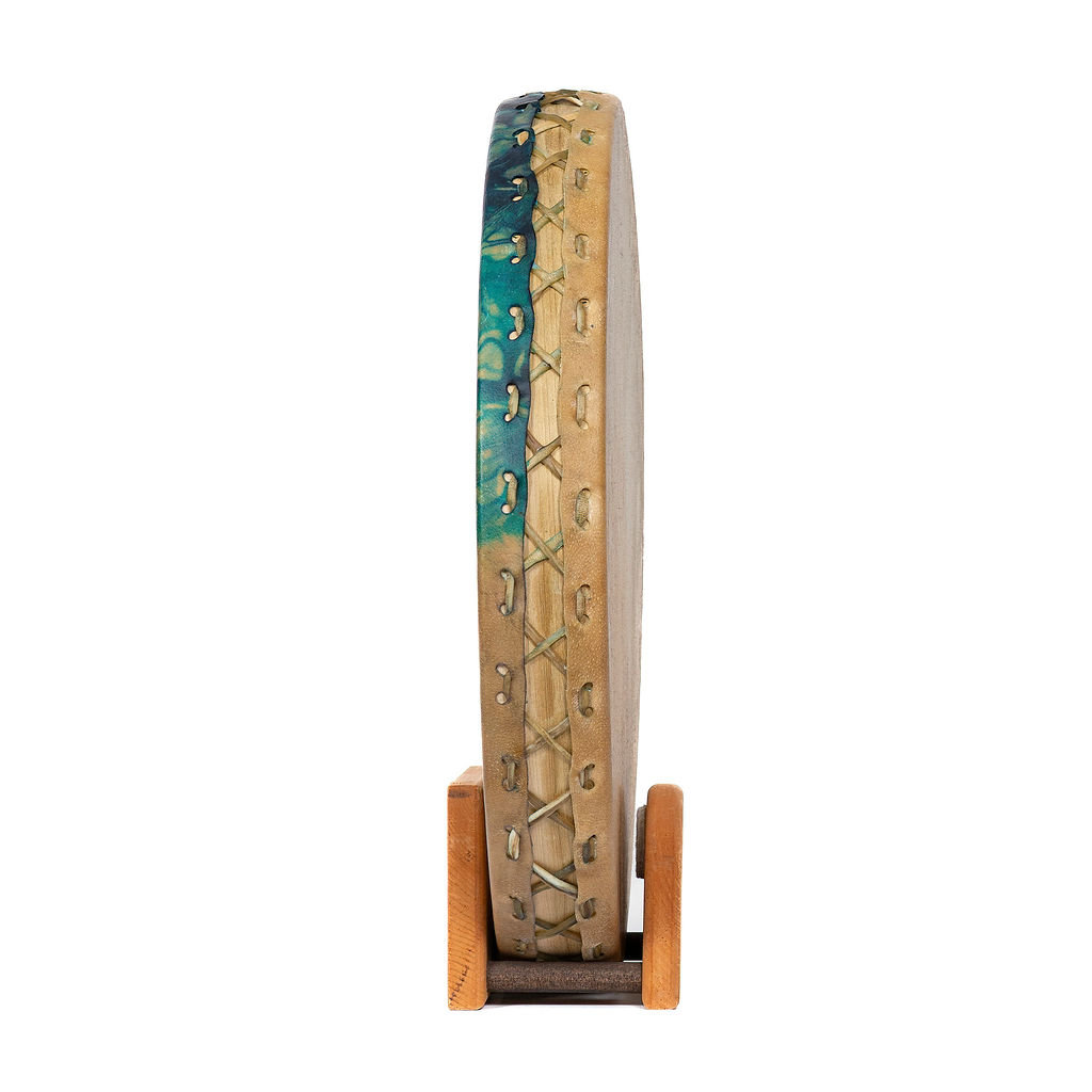 Le tambour Océan est fait de deux peaux de Bison, un cadre en bois d’érable et des billes de cuivre.